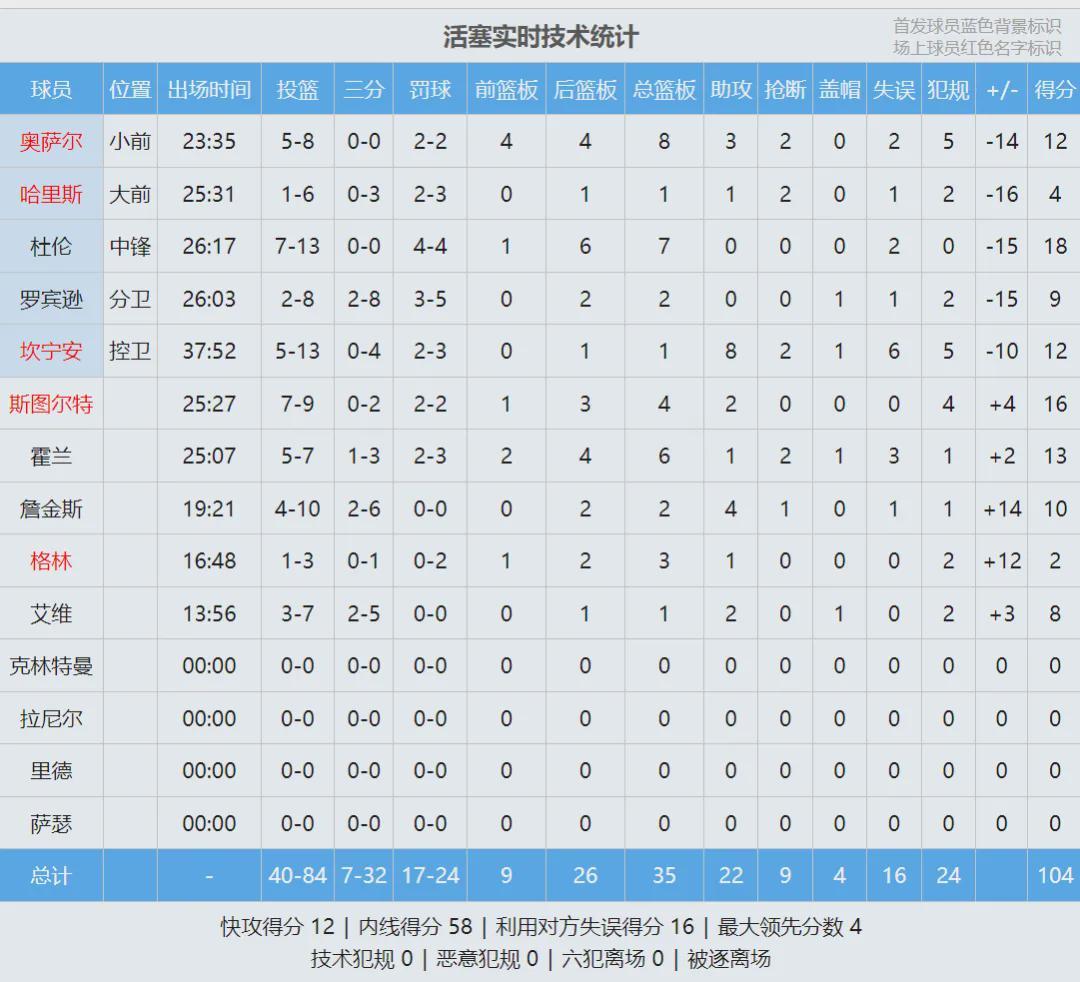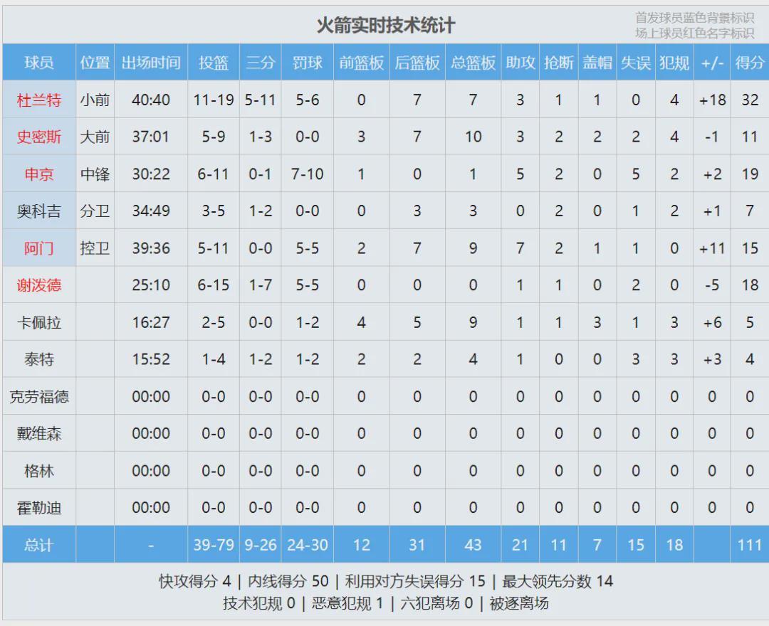 全场结束,火箭111-104击败活塞。杜兰特19投11中,砍下32分6篮板3助攻1抢断1盖帽,正负值+18全队最高,三分命中数升至历史第11。申京19分1板5助2断、谢泼德18分、阿门15分9板7助2断;奥萨尔12分8板3助2断。